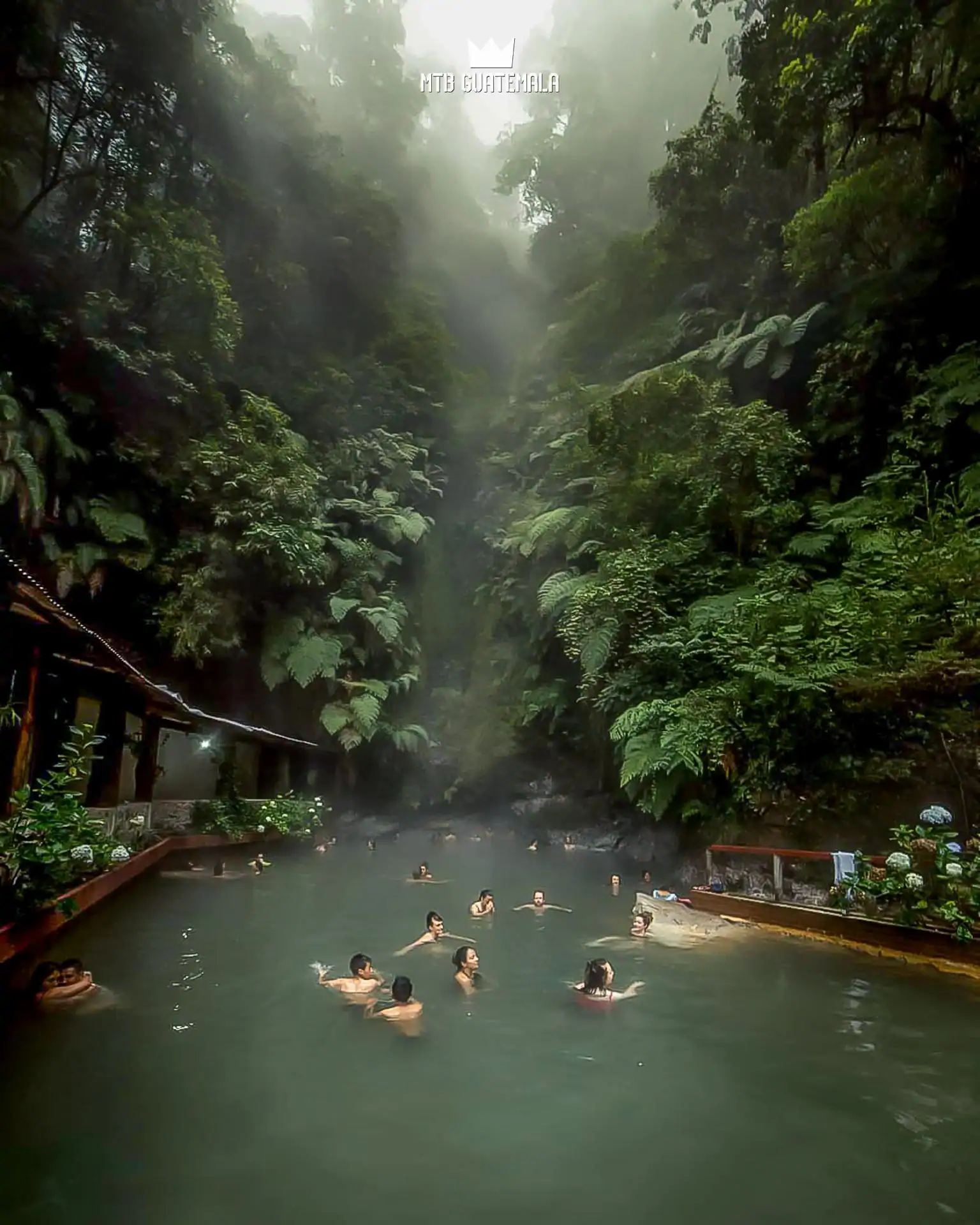 Natural hot springs on the flanks of the Zunil Volcano in Quetzaltenango framed by a steep, high wall of tropical vines, ferns and flowers. The setting is intensely tropical, an elevation (2550m) and keeps the air cool.